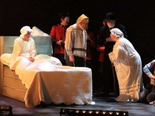 The musicians lead us to the wedding. The company sings (“SUNRISE, SUNSET”) as the traditional Jewish ceremony takes place. To the villagers’ dismay, Perchik asks Hodel to dance with him and she accepts, performing the forbidden act of dancing with a man. Everyone else follows suit. As the dance reaches a wild high point, the Constable and his men enter. They destroy everything in sight. Perchik grapples with a Russian and is hit with a club. The constable bows to Tevye and says ” I am genuinely sorry. You understand?” Tevye replies with mock courtesy, “Of course.” The family begins to clean up after the destruction.